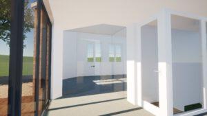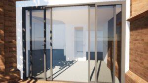 Impressie van de entree en toegang tot de consistorie met royaal gebruik van glas.